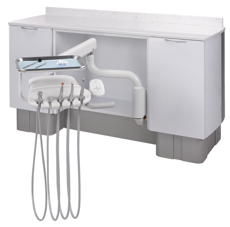 Door de ergernis die dit met zich meebrengt laat men de cart dan maar vaak in het looppad staan wat het uitstappen van de patiënt belemmert en een barrière creëert tussen u en uw patiënt. De in de meeste gevallen – geribbelde - verbindingsslang is een bron voor vuil, bacteriën en excessieve slijtage (scheuren). De A-dec 342 behandelunit draait u in een eenvoudige beweging opzij. De A-dec 342 kan autonoom gebruikt worden of in combinatie met een van de A-dec behandelstoelen.