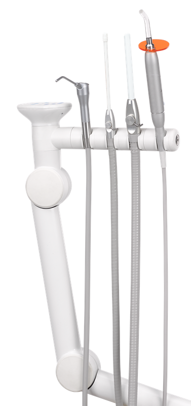 De A-dec 500 is zodanig slim geconstrueerd dat u in de uitvoering met zweep of hangende slangen in nagenoeg elke door u gewenste positie optimaal kunt werken. Door de naaf onder de patiëntenstoel is de behandeleenheid in een handomdraai van een rechtshandige naar een linkshandige versie om te zetten en heeft u een maximaal bereik in alle posities.